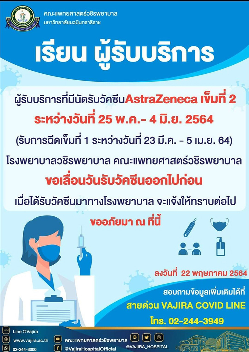 รพ.วชริพยาบาล แจ้งเลื่อนฉีดวัคซีนแอสตร้าเซนเนก้าเข็มที่ 2 ระหว่างวันที่ 25 พ.ค. - 4 มิ.ย. พร้อมระบุ เมื่อได้รับวัคซีนจะแจ้งให้ทราบต่อไป