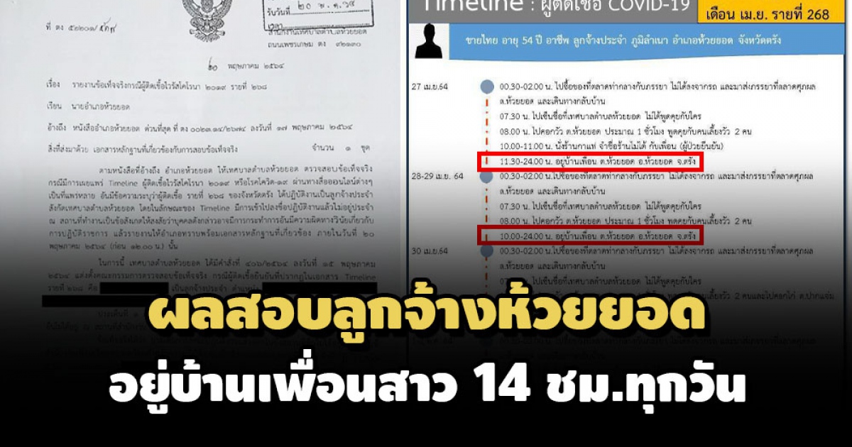 “ส่วนไทม์ไลน์ที่ระบุช่วงเวลา 10.00-24.00 น. ของทุกวันว่าไปอยู่ที่บ้านเพื่อนนั้น ผลสอบระบุว่าไปอยู่บ้านผู้หญิงคนหนึ่ง โดยผลตรวจยืนยันออกมาแล้วว่า หญิงรายดังกล่าวและลูกๆ รวม 3 ราย ติดเชื้อโควิดจากการตรวจเชื้อครั้งที่ 2 ซึ่งขณะนี้เจ้าหน้าที่กำลังเข้าไปตรวจผู้สัมผัสเสี่ยงรายอื่นๆ ภายในซอยของบ้านดังกล่าวแล้ว” นายอำเภอห้วยยอดกล่าว