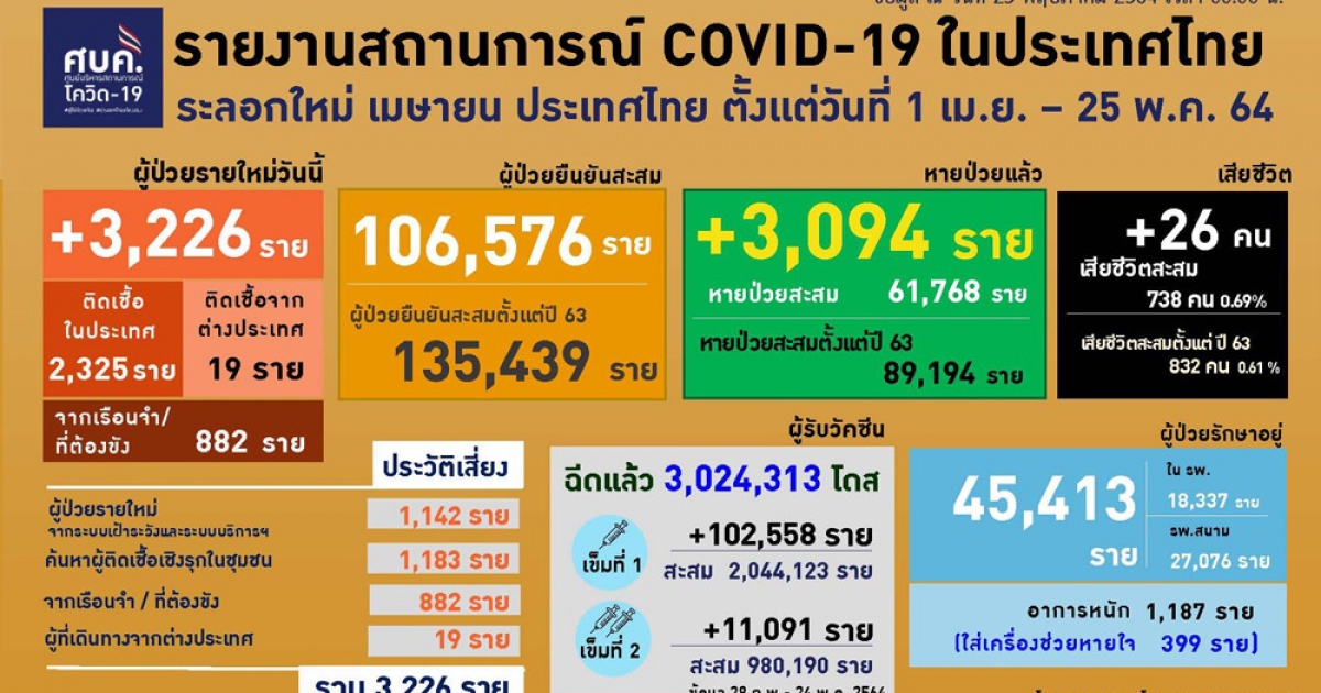 สำนักข่าวอิศรา (www.isranews.org) รายงานว่า รายงานว่า เมื่อวันที่ 25 พ.ค.2564 เวลา 12.30 น. พญ.อภิสมัย ศรีรังสรรค์ ผู้ช่วยโฆษกศูนย์บริหารสถานการณ์โควิด (ศบค.) แถลงสถานการณ์ประจำวัน โดยพบผู้ติดป่วยรายใหม่ 3,226 ราย แบ่งเป็นการติดเชื้อในประเทศ 3,205 ราย เกิดจากระบบเฝ้าระวังและระบบบริการฯ 1,142 ราย เกิดจากการค้นหาเชิงรุกและพบการติดเชื้อในชุมชน 1,183 ราย ติดเชื้อภายในเรือนจำ 882 ราย และอีก 19 รายเดินทางกลับมาจากต่างประเทศ รวมผู้ป่วยสะสม 136,439 ราย หายป่วยเพิ่ม 3,094 ราย อยู่ระหว่างรักษาตัวในโรงพยาบาล 45,413 ราย โดยในจำนวนนี้มีอาการหนัก 1,187 ราย และใส่ท่อช่วยหายใจ 399 ราย เสียชีวิตเพิ่ม 26 ราย รวมเสียชีวิตสะสม 832 ราย