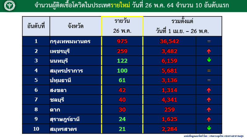 โดย 10 จังหวัดที่มีอันดับผู้ติดเชื้อโควิดรายใหม่สูงสุด ตามลำดับ ได้แก่ กทม. 975 ราย เพชรบุรี 259 ราย นนทบุรี 122 ราย สมุทรปราการ 100 ราย ปทุมธานี 61 ราย สงขลา 42 ราย ชลบุรี 40 ราย ตาก 30 ราย สุราษฎร์ธานี 24 ราย และสมุทรสาคร 21 ราย