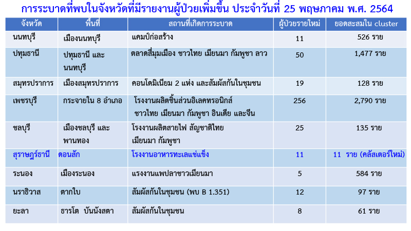 นพ.ทวีศิลป์ กล่าวถึงผู้ติดเชื้อในพื้นที่จังหวัดต่างๆ นอกเหนือจากทม. ว่าต ามข้อมูล ณ วันที่ 25 พ.ค.2564 ยังคงมีหลายคลัสเตอร์ที่ต้องติดตาม ประกอบด้วย