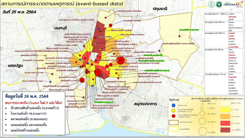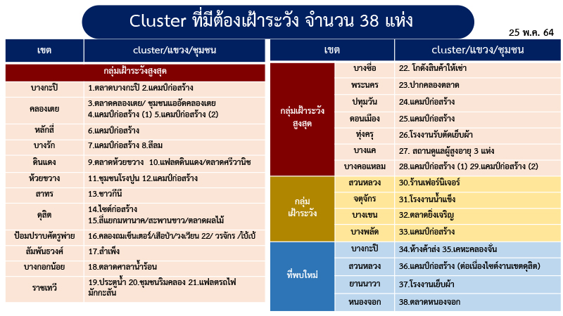 โดยพบคลัสเตอร์ใหม่ในพื้นที่กทม.อีก 5 คลัสเตอร์ ได้แก่ ห้างสรรพสินค้าแห่งหนึ่งในถนนลาดพร้าว โรงงานเย็บผ้าแห่งหนึ่งในเขตยานนาวา ตลาดแห่งหนึ่ง ในเขตหนองจอก เคหะแห่งหนึ่ง ในเขตคลองจั่น และแคมป์ก่อสร้าง ในเขตสวนหลวง ทำให้ยอดรวมคลัสเตอร์จากเดิม 33 คลัสเตอร์ เพิ่มเป็น 38 คลัสเตอร์