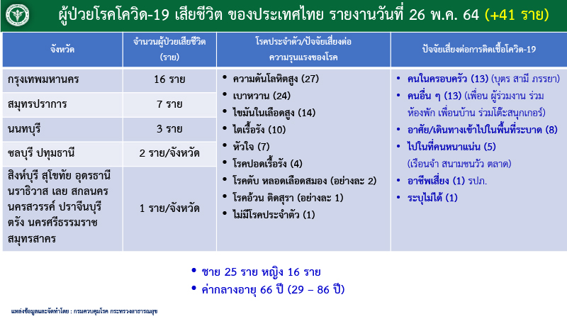สำหรับผู้เสียชีวิต 41 ราย มาจาก กทม. 16 ราย สมุทรปราการ 7 ราย นนทบุรี 3 ราย ชลบุรี ปทุมธานี จังหวัดละ 2 ราย สิงห์บุรี สุโขทัย อุดรธานี นราธิวาส เลย สกลนคร นครสวรรค์ ปราจีนบุรี ตรัง นครศรีธรรมราช สมุทราสาคร จังหวัดละ 1 ราย เป็นชาย 25 ราย หญิง 16 ราย มีอายุระหว่าง 29-86 ปี
