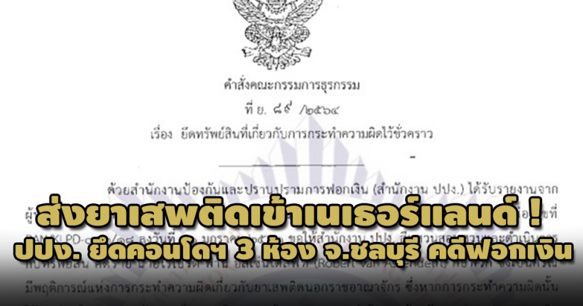 ปปง.สั่งยึด คอนโดฯ 3 ห้อง จ.ชลบุรี รถยนต์ 1 คัน ‘โรเบิร์ต ฟาน อัสเซ่นเดลฟท์’ พฤติกรรมตั้งบริษัทขนส่งยาเสพติดเข้าเนเธอแลนด์ กระทำความผิดนอกราชอาณาจักร ผิด กม.ปราบปรามการฟอกเงิน คนไทยถือครอง