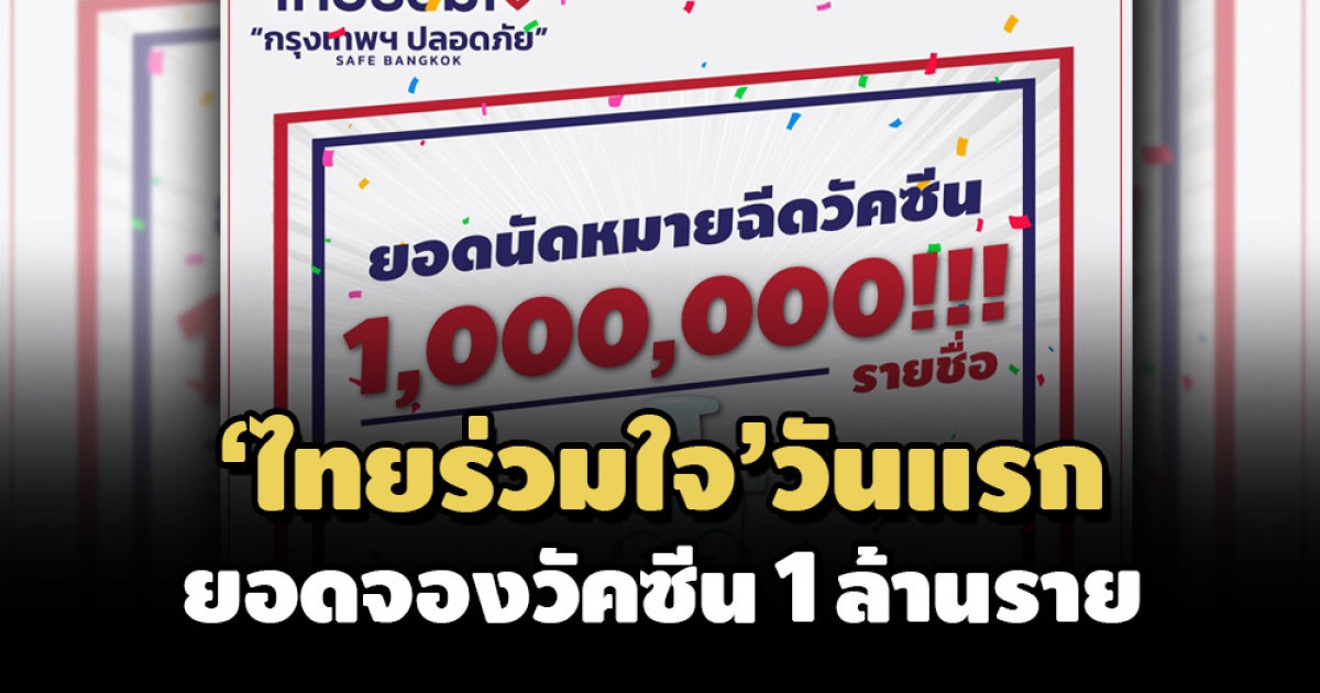 กทม.เผยยอดคนลงทะเบียนจองฉีดวัคซีนโควิดผ่านโครงการ 'ไทยร่วมใจ กรุงเทพฯปลอดภัย' วันแรก มีประชาชนลงชื่อทุกช่องทางมากกว่า 1 ล้านราย ยันวัคซีนที่ฉีดคือ แอสตร้าเซนเนก้า แจ้งพรุ่งนี้ปรับปรุงระบบ เริ่มเปิดลงทะเบียน 9 โมง