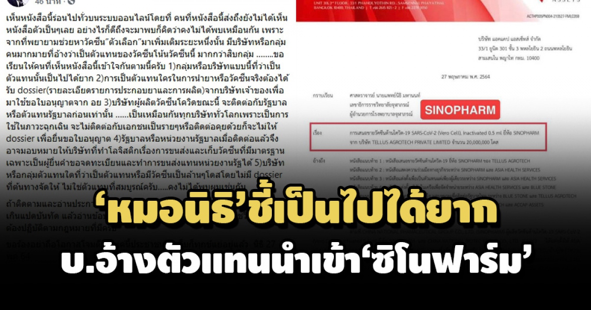 จากกรณีที่มีการเผยแพร่จดหมายจากบริษัท แอคแคป แอสเซ็ทส์ จำกัด ส่งถึง ศ.นพ.นิธิ มหานนท์ เลขาธิการราชวิทยาลัยจุฬาภรณ์ โดยระบุว่ามีวัคซีนซิโนฟาร์ม 20 ล้านโดสพร้อมส่งให้ไทย แต่ตลอด 1 เดือนที่ผ่านมาไม่สามารถติดต่อรัฐบาลนั้น