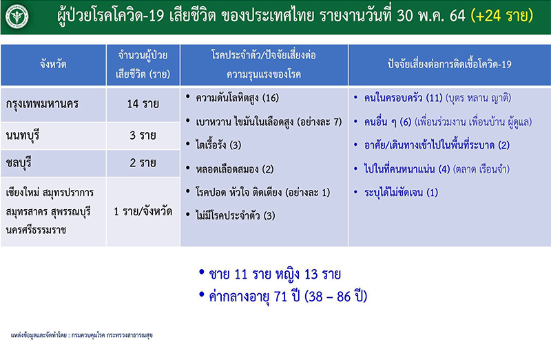 สำหรับผู้เสียชีวิต 24 ราย มาจาก กทม. 14 ราย นนทบุรี 3 ราย ชลบุรี 2 ราย เชียงใหม่ สมุทรปราการ สมุทรสาคร สุพรรณบุรี และนครศรีธรรมราช จังหวัดละ 1 ราย เป็นชาย 11 ราย หญิง 13 ราย มีอายุระหว่าง 38 - 86 ปี มีค่าเฉลี่ยอายุอยู่ที่ 71 ปี
