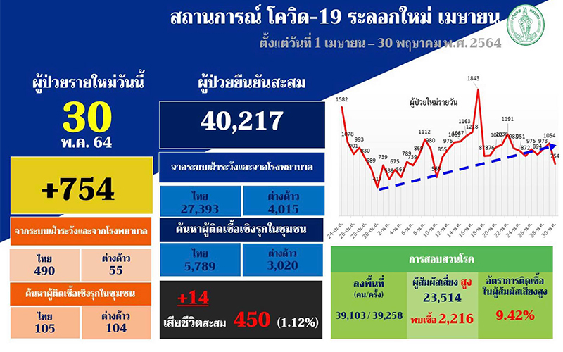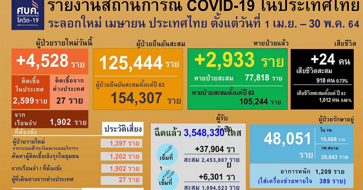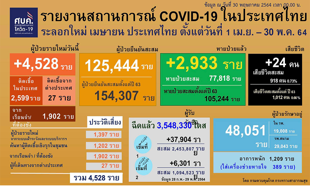 สำนักข่าวอิศรา (www.isranews.org) รายงานว่า รายงานว่า เมื่อวันที่ 30 พ.ค.2564 เวลา 12.30 น. พญ.อภิสมัย ศรีรังสรรค์ ผู้ช่วยโฆษกศูนย์บริหารสถานการณ์โควิด (ศบค.) แถลงสถานการณ์ประจำวัน โดยพบผู้ติดป่วยรายใหม่ 4,528 ราย แบ่งเป็นการติดเชื้อในประเทศ 2,599 ราย เกิดจากระบบเฝ้าระวังและระบบบริการฯ 1,397 ราย เกิดจากการค้นหาเชิงรุกและพบการติดเชื้อในชุมชน 1,202 ราย ติดเชื้อภายในเรือนจำ 1,902 ราย และอีก 27 ราย เดินทางกลับมาจากต่างประเทศ รวมผู้ป่วยสะสม 154,307 ราย หายป่วยเพิ่ม 2,933 ราย อยู่ระหว่างรักษาตัวในโรงพยาบาล 48,051 ราย โดยในจำนวนนี้มีอาการหนัก 1,209 ราย และใส่ท่อช่วยหายใจ 389 ราย เสียชีวิตเพิ่ม 24 ราย รวมเสียชีวิตสะสม 918 ราย