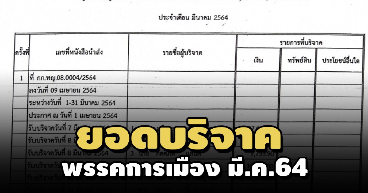 • ยอดเงินบริจาคพรรค มี.ค.64 ‘ก้าวไกล’ 3.2 ล. ‘พิธา’ 1 ล.‘พิจารณ์’ควักอีก 2 ล.