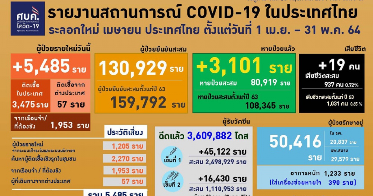 สำนักข่าวอิศรา (www.isranews.org) รายงานว่า เมื่อวันที่ 31 พ.ค.2564 เวลา 12.30 น. พญ.อภิสมัย ศรีรังสรรค์ ผู้ช่วยโฆษกศูนย์บริหารสถานการณ์โควิด (ศบค.) แถลงสถานการณ์ประจำวัน โดยพบผู้ติดป่วยรายใหม่ 5,485 ราย แบ่งเป็นการติดเชื้อในประเทศ 5,428 ราย เกิดจากระบบเฝ้าระวังและระบบบริการฯ 2,270 ราย เกิดจากการค้นหาเชิงรุกและพบการติดเชื้อในชุมชน 2,270 ราย ติดเชื้อภายในเรือนจำ 1,953 ราย และอีก 57 รายเดินทางกลับมาจากต่างประเทศ รวมผู้ป่วยสะสม 159,792 ราย หายป่วยเพิ่ม 3,101 ราย อยู่ระหว่างรักษาตัวในโรงพยาบาล 50,416 ราย โดยในจำนวนนี้มีอาการหนัก 1,233 ราย และใส่ท่อช่วยหายใจ 390 ราย เสียชีวิตเพิ่ม 19 ราย รวมเสียชีวิตสะสม 1,031 ราย