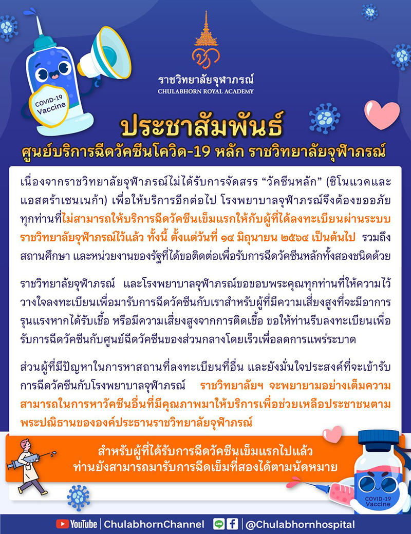 ราชวิทยาลัยจุฬาภรณ์ และโรงพยาบาลจุฬาภรณ์ขอขอบพระคุณทุกท่านที่ให้ความไว้วางใจลงทะเบียนเพื่อมารับการฉีดวัคซีนกับเรา และขอขอบคุณจิตอาสาและเจ้าหน้าที่จากองค์กรต่างๆ ที่ให้การสนับสนุนการบริการฉีดวัคซีนของโรงพยาบาลจุฬาภรณ์มาโดยตลอด