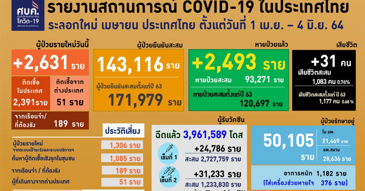 สำนักข่าวอิศรา (www.isranews.org) รายงานว่า รายงานว่า เมื่อวันที่ 4 มิ.ย.2564 เวลา 12.30 น. พญ.อภิสมัย ศรีรังสรรค์ ผู้ช่วยโฆษกศูนย์บริหารสถานการณ์โควิด (ศบค.) แถลงสถานการณ์ประจำวัน โดยพบผู้ติดป่วยรายใหม่ 2,631 ราย แบ่งเป็นการติดเชื้อในประเทศ 2,391 ราย เกิดจากระบบเฝ้าระวังและระบบบริการฯ 1,306 ราย เกิดจากการค้นหาเชิงรุกและพบการติดเชื้อในชุมชน 1,085 ราย ติดเชื้อภายในเรือนจำ 189 ราย และอีก 51 ราย เดินทางกลับมาจากต่างประเทศ รวมผู้ป่วยสะสม 171,979 ราย หายป่วยเพิ่ม 2,493 ราย อยู่ระหว่างรักษาตัวในโรงพยาบาล 50,105 ราย โดยในจำนวนนี้มีอาการหนัก 1,182 ราย และใส่ท่อช่วยหายใจ 376 ราย เสียชีวิตเพิ่ม 31 ราย รวมเสียชีวิตสะสม 1,177 ราย