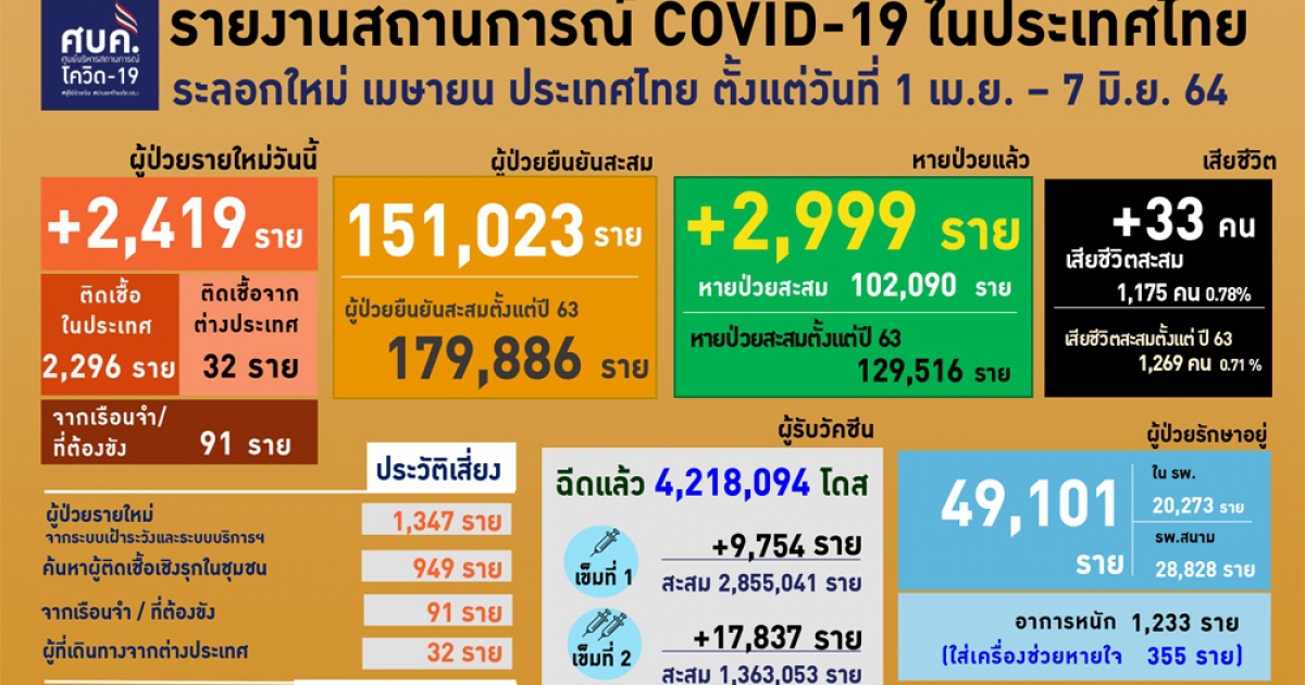 สำนักข่าวอิศรา (www.isranews.org) รายงานว่า รายงานว่า เมื่อวันที่ 7 มิ.ย.2564 เวลา 12.30 น. นพ.ทวีศิลป์ วิษณุโยธิน โฆษกศูนย์บริหารสถานการณ์โควิด (ศบค.) แถลงสถานการณ์ประจำวัน โดยพบผู้ติดป่วยรายใหม่ 2,419 ราย แบ่งเป็นการติดเชื้อในประเทศ 2,296 ราย เกิดจากระบบเฝ้าระวังและระบบบริการฯ 1,347 ราย เกิดจากการค้นหาเชิงรุกและพบการติดเชื้อในชุมชน 949 ราย ติดเชื้อภายในเรือนจำ 91 ราย และอีก 32 ราย เดินทางกลับมาจากต่างประเทศ รวมผู้ป่วยสะสม 179,886 ราย หายป่วยเพิ่ม 2,999 ราย อยู่ระหว่างรักษาตัวในโรงพยาบาล 49,101 ราย โดยในจำนวนนี้มีอาการหนัก 1,233 ราย และใส่ท่อช่วยหายใจ 355 ราย เสียชีวิตเพิ่ม 33 ราย รวมเสียชีวิตสะสม 1,236 ราย