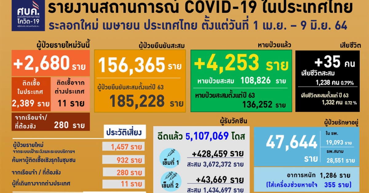 สำนักข่าวอิศรา (www.isranews.org) รายงานว่า รายงานว่า เมื่อวันที่ 9 มิ.ย.2564 เวลา 12.30 น. พญ.อภิสมัย ศรีรังสรรค์ ผู้ช่วยโฆษกศูนย์บริหารสถานการณ์โควิด (ศบค.) แถลงสถานการณ์ประจำวัน โดยพบผู้ติดป่วยรายใหม่ 2,680 ราย แบ่งเป็นการติดเชื้อในประเทศ 2,389 ราย เกิดจากระบบเฝ้าระวังและระบบบริการฯ 1,457 ราย เกิดจากการค้นหาเชิงรุกและพบการติดเชื้อในชุมชน 932 ราย ติดเชื้อภายในเรือนจำ 280 ราย และอีก 11 ราย เดินทางกลับมาจากต่างประเทศ รวมผู้ป่วยสะสม 185,228 ราย หายป่วยเพิ่ม 4,253 ราย อยู่ระหว่างรักษาตัวในโรงพยาบาล 47,644 ราย โดยในจำนวนนี้มีอาการหนัก 1,286 ราย และใส่ท่อช่วยหายใจ 355 ราย เสียชีวิตเพิ่ม 35 ราย รวมเสียชีวิตสะสม 1,332 ราย
