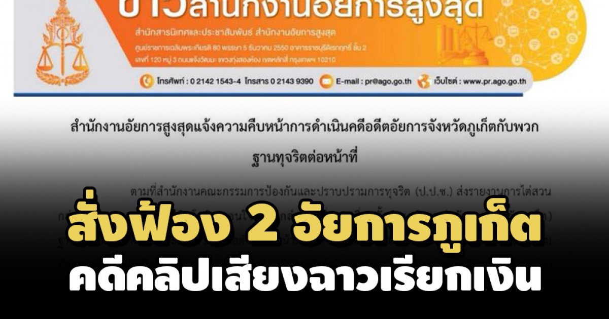 อสส.สั่งฟ้อง 2 อัยการภูเก็ต คดีคลิปเสียงฉาววิ่งเต้นเรียกรับเงิน อยู่ระหว่าง ป.ป.ช.ประสานนำตัว ส่งฟ้องศาลอาญาคดีทุจริตฯภาค 8