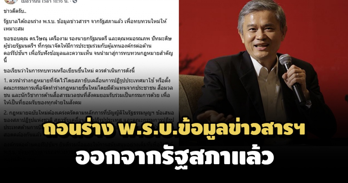 ผู้สื่อข่าวรายงานว่า เมื่อวันที่ 10 มิ.ย.2564 นายมานะ นิมิตรมงคล เลขาธิการองค์การต่อต้านคอร์รัปชัน (ประเทศไทย) โพสต์ข้อความผ่านเฟซบุ๊ก มานะ นิมิตรมงคล ว่า รัฐบาลได้ถอนร่าง พ.ร.บ.ข้อมูลข่าวสารฯ จากรัฐสภาแล้ว เพื่อทบทวนใหม่ให้เหมาะสม ทั้งนี้ขอขอบคุณ นายวิษณุ เครืองาม รองนายกรัฐมนตรี และ นายรณภพ ปัทมะดิษ ผู้ช่วยรัฐมนตรี ที่กรุณาจัดให้มีการประชุมร่วมกับผู้แทนองค์กรต่อต้านคอร์รัปชันฯ เพื่อรับฟังข้อมูลและความเห็นจนนำมาสู่การทบทวนกฎหมายสำคัญนี้ โดยในการทบทวนหรือเขียนร่าง พ.ร.บ.ข้อมูลข่าวสารฯขึ้นใหม่ ควรดำเนินการ ดังนี้