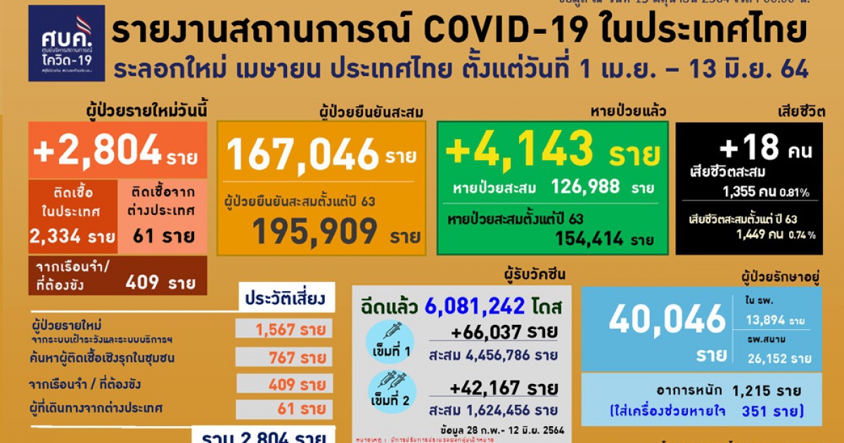 สำนักข่าวอิศรา (www.isranews.org) รายงานว่า เมื่อวันที่ 13 มิ.ย.2564 ศูนย์บริหารสถานการณ์โควิด (ศบค.) รายงานสถานการณ์ประจำวัน โดยพบผู้ติดป่วยรายใหม่ 2,804 ราย แบ่งเป็นการติดเชื้อในประเทศ 2,334 ราย เกิดจากระบบเฝ้าระวังและระบบบริการฯ 1,567 ราย เกิดจากการค้นหาเชิงรุกและพบการติดเชื้อในชุมชน 767 ราย ติดเชื้อภายในเรือนจำ 409 ราย และอีก 61 รายเดินทางกลับมาจากต่างประเทศ รวมผู้ป่วยสะสม 195,909 ราย หายป่วยเพิ่ม 4,143 ราย อยู่ระหว่างรักษาตัวในโรงพยาบาล 40,046 ราย โดยในจำนวนนี้มีอาการหนัก 1,215 ราย และใส่ท่อช่วยหายใจ 351 ราย เสียชีวิตเพิ่ม 18 ราย รวมเสียชีวิตสะสม 1,449 ราย