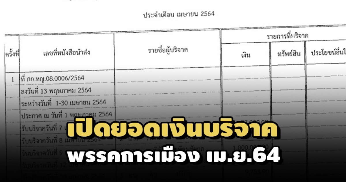 ยอดเงินบริจาคพรรคการเมือง เม.ย.64 ‘ก้าวไกล’ ยังมาต่อเนื่อง 2.14 ล้าน ‘พิจารณ์’ ควักอีก 1 ล้าน ยอดรวมปีนี้ 5 ล้าน ปชป. ‘อิสระ เสรีวัฒนวุฒิ’ รองเลขาฯ ควัก 2 ล้าน