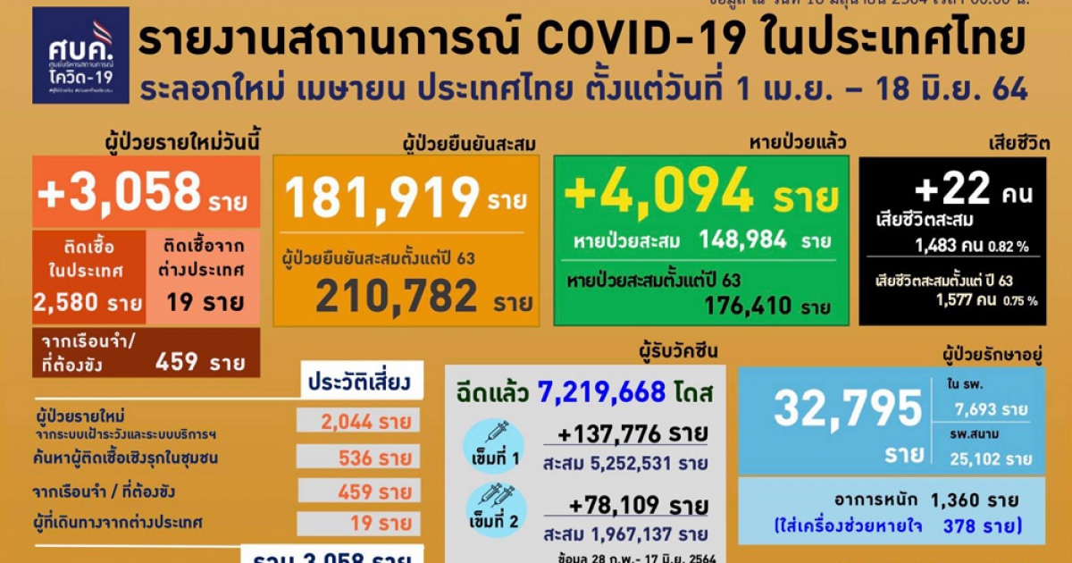 สำนักข่าวอิศรา (www.isranews.org) รายงานว่า เมื่อวันที่ 18 มิ.ย.2564 เวลา 12.30 น. นพ.ทวีศิลป์ วิษณุโยธิน โฆษกศูนย์บริหารสถานการณ์โควิด (ศบค.) แถลงสถานการณ์ประจำวัน โดยพบผู้ติดป่วยรายใหม่ 3,058 ราย แบ่งเป็นการติดเชื้อในประเทศ 2,580 ราย เกิดจากระบบเฝ้าระวังและระบบบริการฯ 2,044 ราย เกิดจากการค้นหาเชิงรุกและพบการติดเชื้อในชุมชน 536 ราย ติดเชื้อภายในเรือนจำ 459 ราย และอีก 19 รายเดินทางกลับมาจากต่างประเทศ รวมผู้ป่วยสะสม 210,782 ราย หายป่วยเพิ่ม 4,094 ราย อยู่ระหว่างรักษาตัวในโรงพยาบาล 32,795 ราย โดยในจำนวนนี้มีอาการหนัก 1,360 ราย และใส่ท่อช่วยหายใจ 378 ราย เสียชีวิตเพิ่ม 22 ราย รวมเสียชีวิตสะสม 1,577 ราย