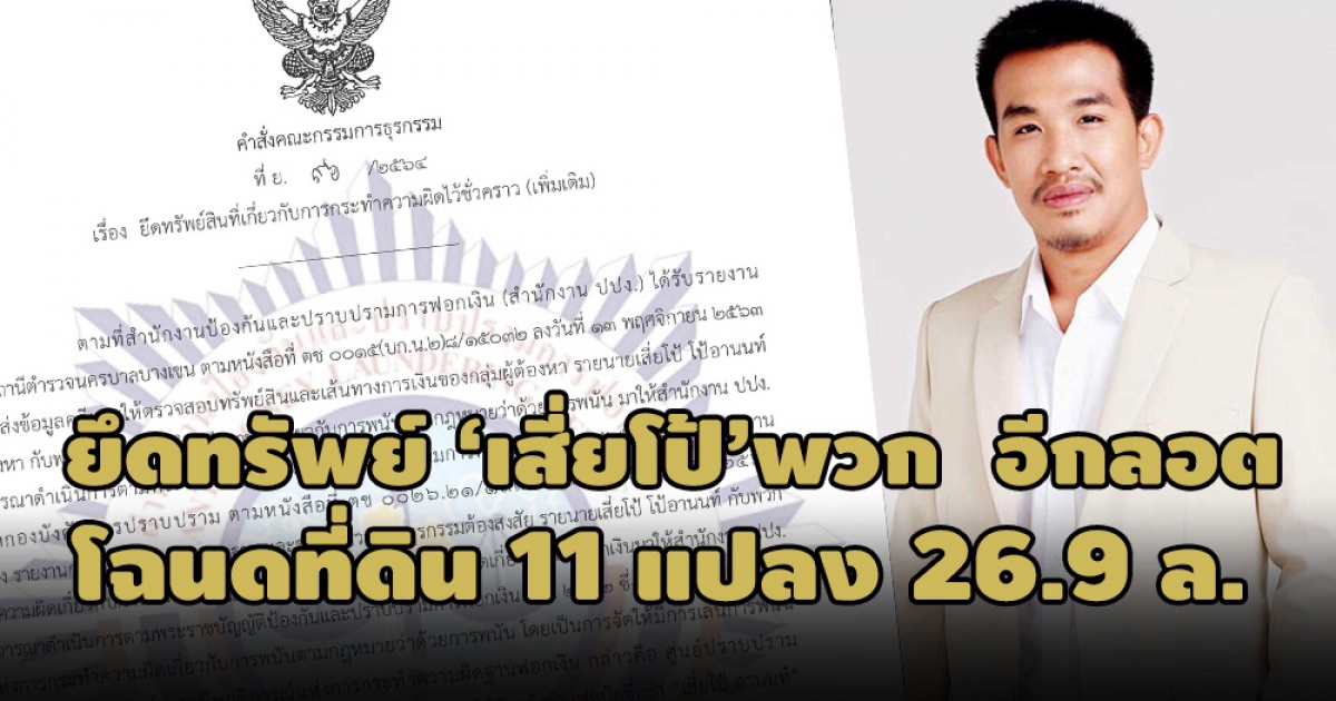 โดนลอต 4 ปปง.ยึดทรัพย์ ‘เสี่ยโป้’ กับพวก ที่ดิน 11 แปลง 26.9 ล. พร้อมลิ่งปลูกสร้าง 3 บุคคลถือครอง ติดจำนอง 5 แปลง ก่อนหน้า 3 ครั้ง เบ็ดเสร็จ 220 รายการ 203.5 ล.