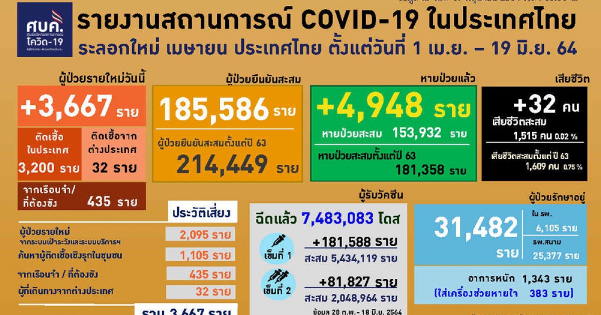 สำนักข่าวอิศรา (www.isranews.org) รายงานว่า เมื่อวันที่ 19 มิ.ย.2564 เวลา 12.30 น. ศูนย์บริหารสถานการณ์โควิด (ศบค.) เปิดเผยสถานการณ์ประจำวัน โดยพบผู้ติดป่วยรายใหม่ 3,667 ราย แบ่งเป็นการติดเชื้อในประเทศ 3,200 ราย เกิดจากระบบเฝ้าระวังและระบบบริการฯ 2,095 ราย เกิดจากการค้นหาเชิงรุกและพบการติดเชื้อในชุมชน 1,105 ราย ติดเชื้อภายในเรือนจำ 435 ราย และอีก 32 รายเดินทางกลับมาจากต่างประเทศ รวมผู้ป่วยสะสม 214,449 ราย หายป่วยเพิ่ม 4,948 ราย อยู่ระหว่างรักษาตัวในโรงพยาบาล 31,482 ราย โดยในจำนวนนี้มีอาการหนัก 1,343 ราย และใส่ท่อช่วยหายใจ 383 ราย เสียชีวิตเพิ่ม 32 ราย รวมเสียชีวิตสะสม 1,609 ราย