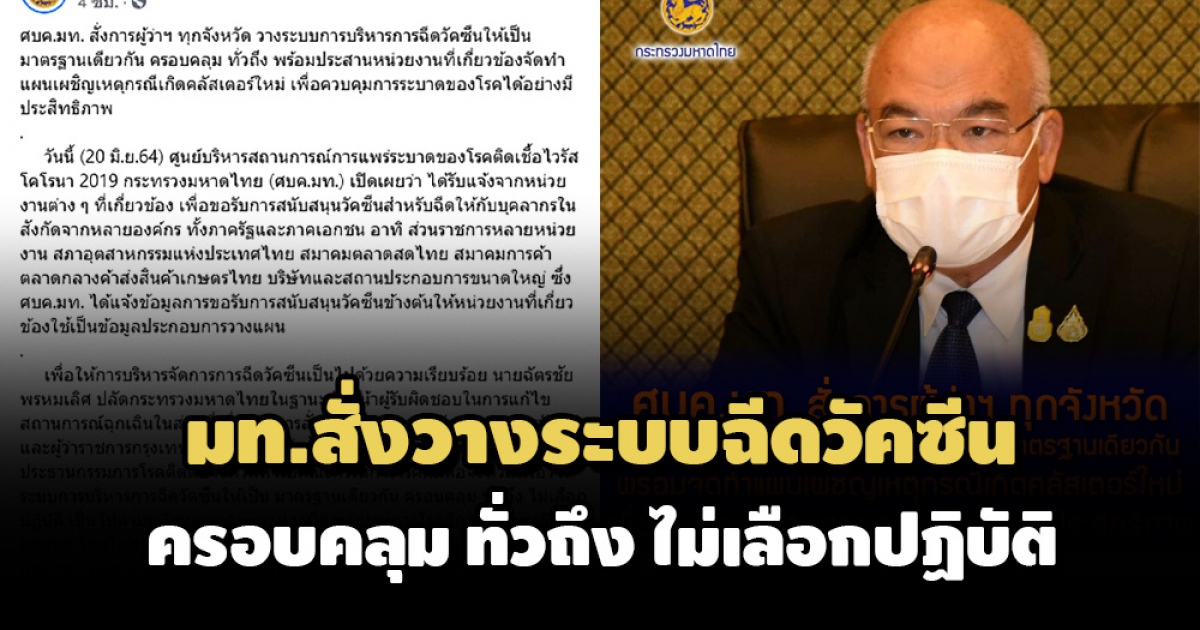 ศบค.มท. สั่งผู้ว่าฯทุกจังหวัด วางระบบฉีดวัคซีนให้เป็นมาตรฐานเดียวกัน ครอบคลุม ทั่วถึง ไม่เลือกปฏิบัติ ให้ความสำคัญกับบุคลากรแพทย์ - เจ้าหน้าที่ด่านหน้า - อาชีพเสี่ยง - ผู้สูงอายุ และผู้ที่มีโรคประจำตัว ส่วนกรณีองค์กรภาครัฐและเอกชน ขอรับวัคซีนให้บุคลากรให้ติดต่อคณะกรรมการโรคติดต่อจังหวัด