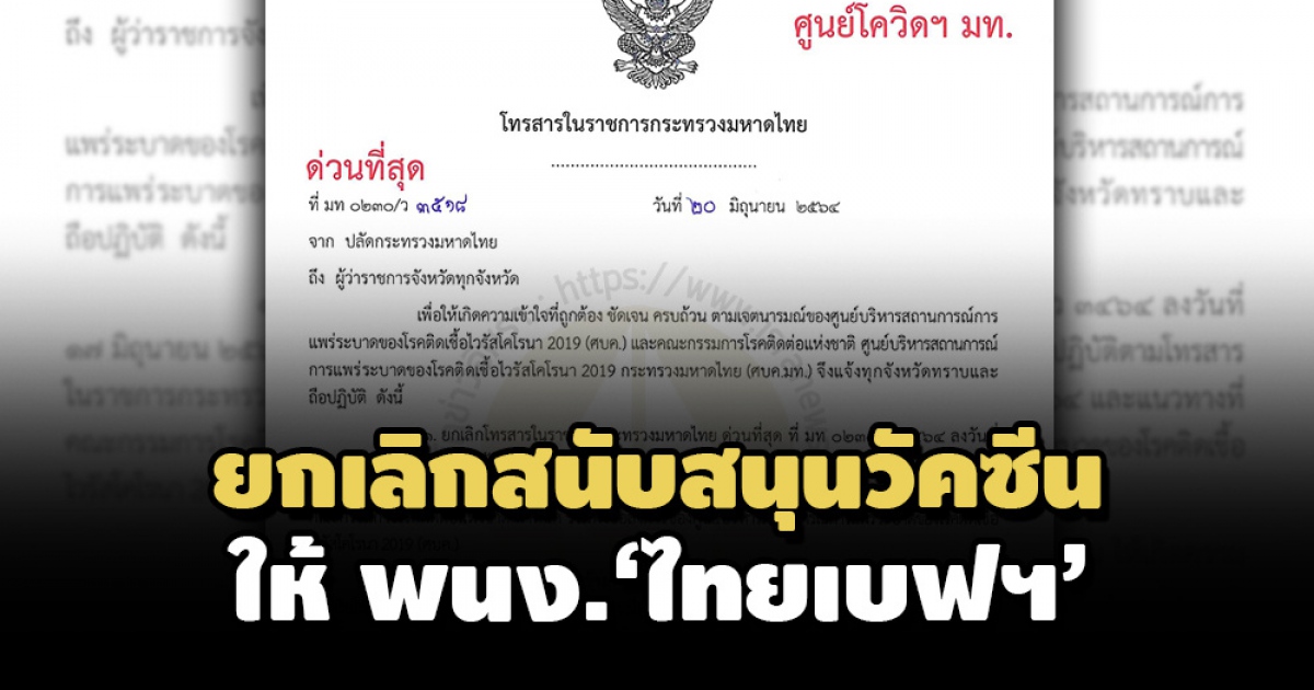 'ฉัตรชัย พรหมเลิศ' ปลัด มท. ทำหนังสือด่วนที่สุด ถึงผู้ว่าฯทุกจังหวัด ยกเลิกการพิจารณาสนับสนุนวัคซีนให้พนักงานและครอบครัว บริษัท ไทยเบฟเวอเรจ จำกัด (มหาชน) พร้อมย้ำแนวทางการบริหารจัดการวัคซีน ให้เป็นไปตามลำดับความสำคัญ