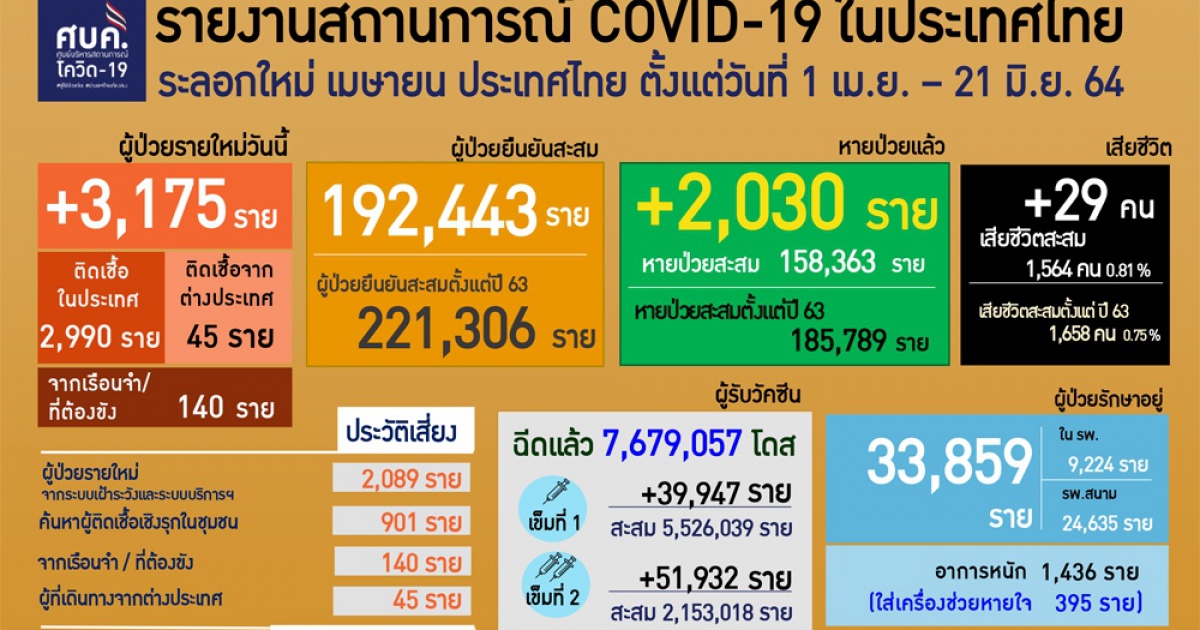 สำนักข่าวอิศรา (www.isranews.org) รายงานว่า รายงานว่า เมื่อวันที่ 21 มิ.ย.2564 เวลา 12.30 น. ศูนย์บริหารสถานการณ์โควิด (ศบค.) รายงานสถานการณ์ประจำวัน โดยพบผู้ติดป่วยรายใหม่ 3,175 ราย แบ่งเป็นการติดเชื้อในประเทศ 2,990 ราย เกิดจากระบบเฝ้าระวังและระบบบริการฯ 2,089 ราย เกิดจากการค้นหาเชิงรุกและพบการติดเชื้อในชุมชน 901 ราย ติดเชื้อภายในเรือนจำ 140 ราย และอีก 45 ราย เดินทางกลับมาจากต่างประเทศ รวมผู้ป่วยสะสม 221,306 ราย หายป่วยเพิ่ม 2,030 ราย อยู่ระหว่างรักษาตัวในโรงพยาบาล 33,859 ราย โดยในจำนวนนี้มีอาการหนัก 1,436 ราย และใส่ท่อช่วยหายใจ 395 ราย เสียชีวิตเพิ่ม 29 ราย รวมเสียชีวิตสะสม 1,658 ราย