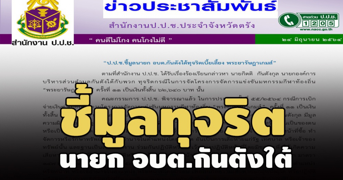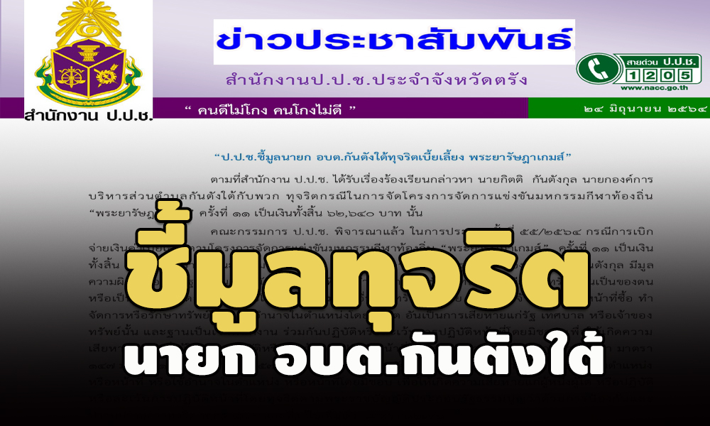 ระบุว่า ตามที่สำนักงาน ป.ป.ช. ได้รับเรื่องร้องเรียนกล่าวหา นายกิตติ กันตังกุล นายกองค์การบริหารส่วนตำบลกันตังใต้กับพวก ทุจริตกรณีในการจัดโครงการจัดการแข่งขันมหกรรมกีฬาท้องถิ่น “พระยารัษฎาเกมส์” ครั้งที่ 11 เป็นเงินทั้งสิ้น 62,640 บาท นั้น