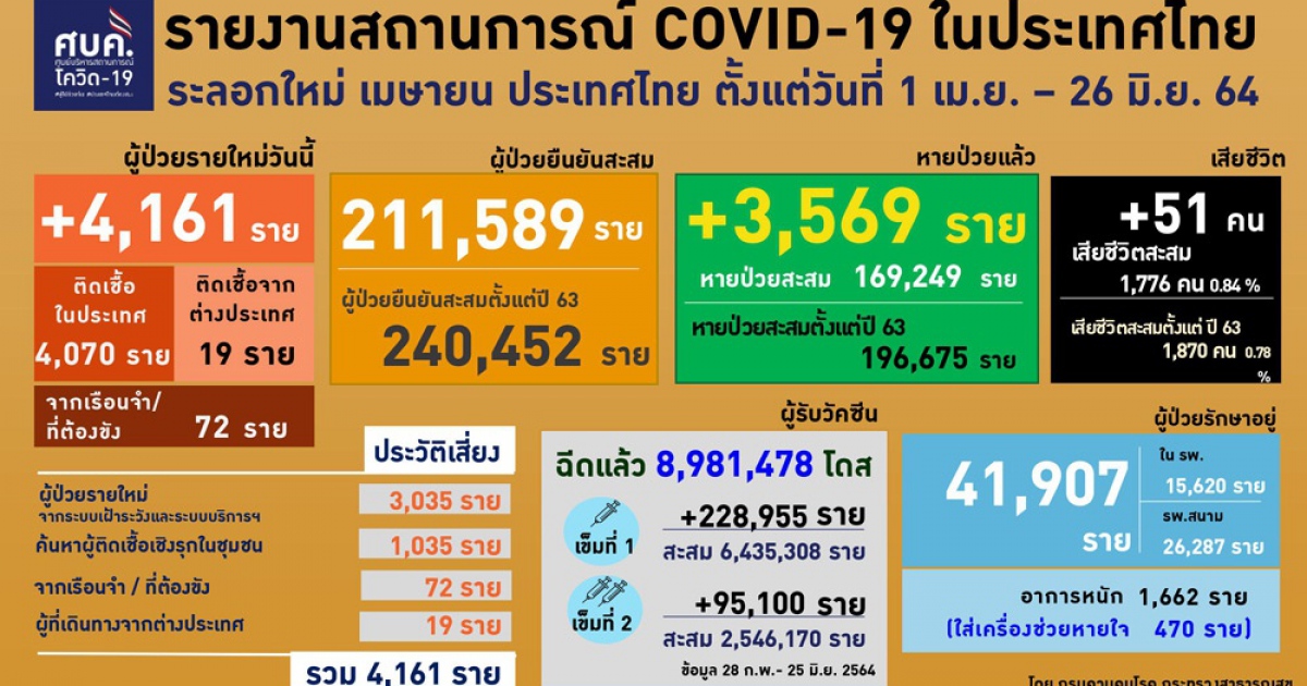 สำนักข่าวอิศรา (www.isranews.org) รายงานว่า เมื่อวันที่ 26 มิ.ย.2564 ศูนย์บริหารสถานการณ์โควิด (ศบค.) เผยแพร่สถานการณ์ประจำวัน โดยพบผู้ติดป่วยรายใหม่ 4,161 ราย แบ่งเป็นการติดเชื้อในประเทศ 4,070 ราย เกิดจากระบบเฝ้าระวังและระบบบริการฯ 3,035 ราย เกิดจากการค้นหาเชิงรุกและพบการติดเชื้อในชุมชน 1,035 ราย ติดเชื้อภายในเรือนจำ 72 ราย และอีก 19 รายเดินทางกลับมาจากต่างประเทศ รวมผู้ป่วยสะสม 240,452 ราย หายป่วยเพิ่ม 3,569 ราย อยู่ระหว่างรักษาตัวในโรงพยาบาล 41,907 ราย โดยในจำนวนนี้มีอาการหนัก 1,662 ราย และใส่ท่อช่วยหายใจ 470 ราย เสียชีวิตเพิ่ม 51 ราย รวมเสียชีวิตสะสม 1,870 ราย