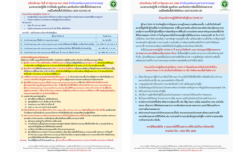 'กรมการแพทย์' ออกแนวทางปฏิบัติ การวินิจฉัน การดูแลรักษา และป้องกันการติดเชื้อใน รพ. ระบุให้ใช้ยาฟ้าทะลายโจรรักษาผู้ป่วยวัยผู้ใหญ่อาการน้อยได้ พร้อมลดเวลารักษาผู้ป่วย 'ไม่มีอาการ-อาการน้อย' สำหรับจังหวัดที่มีปัญหาการบริหารเตียงเหลือ 10 วัน