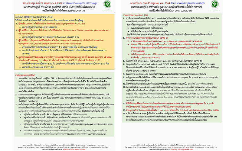 ผู้สื่อข่าวรายงานว่า เมื่อวันที่ 26 มิ.ย.2564 กรมการแพทย์ได้ออก แนวทางเวชปฏิบัติ การวินิจฉัย ดูแลรักษา และป้องกันการติดเชื้อในโรงพยาบาล กรณีติดโควิด สำหรับแพทย์และบุคลากรสาธารณสุขฉบับปรับปรุง วันที่ 25 มิ.ย.2564 มีใจความสำคัญว่า การรักษาผู้ป่วยโควิด ในผู้ป่วยเด็กอายุน้อยกว่า 15 ปี หากไม่มีอาการ แพทย์จะรักษาตามดุลยพินิจ ส่วนผู้ป่วยที่มีอาการ ไม่รุนแรง และไม่มีปัจจัยเสี่ยง จะให้ยาฟาวิพิราเวียร์เป็นเวลา 5 วัน กรณีมีอาการ ไม่รุนแรง แต่มีความเสี่ยงเล็กน้อย จะให้ยาฟาวิพิราเวียร์เบื้องต้นเป็นเวลา 5 วัน หรืออาจนานกว่านั้นหากอาการยังมาก และสำหรับผู้ป่วยที่มีอาการปอดบวม หายใจเร็วผิดปกติ จะให้ยาฟาวิพิราเวียร์เป็นเวลา 5-10 วัน
