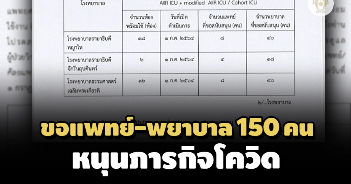 เครือข่ายโรงพยาบาลกลุ่มสถาบันแพทยศาสตร์แห่งประเทศไทย ทำหนังสือถึงปลัด สธ. ขอบุคลากรแพทย์-พยาบาล 150 คน เพื่อสนับสนุนภารกิจช่วยผู้ป่วยโควิด พร้อมระบุยังมีห้องวิกฤตความดันลบ 52 เตียง พร้อมใช้งาน แต่ยังขาดบุคลากรร่วมภารกิจ