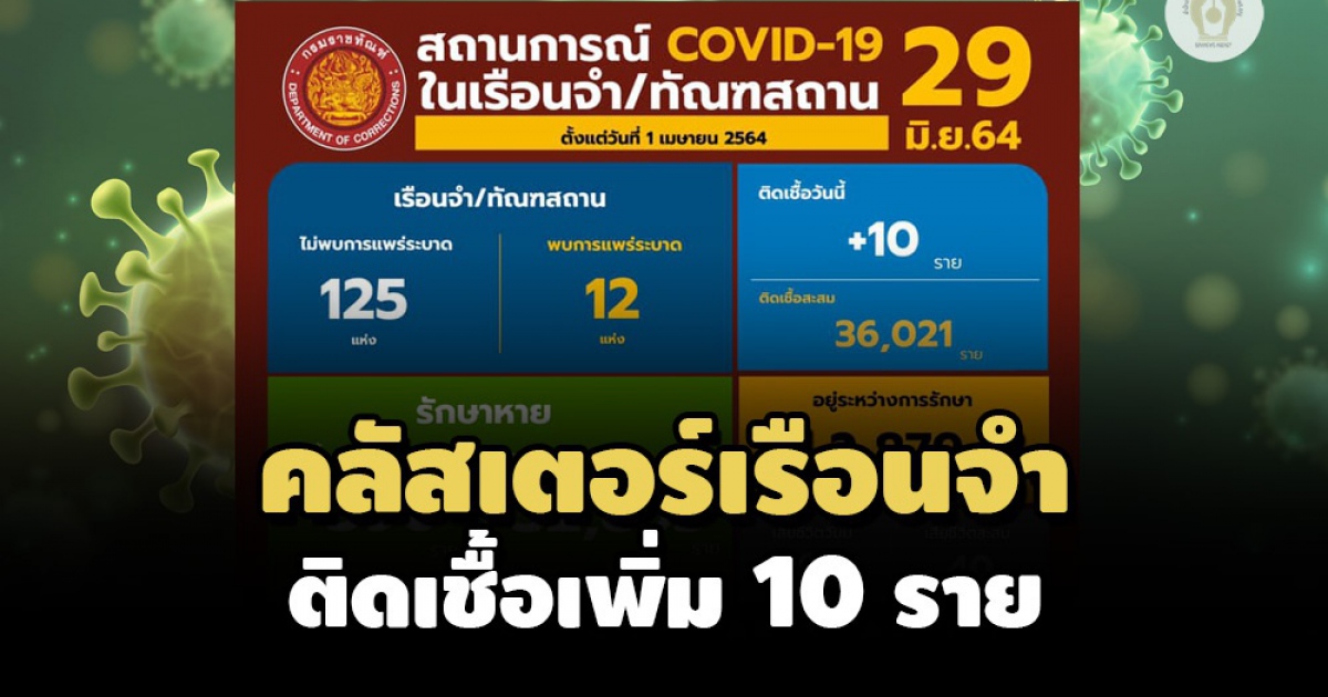 ผู้สื่อข่าวรายงานว่า เมื่อวันที่ 29 มิ.ย.2564 นายอายุตม์ สินธพพันธุ์ อธิบดีกรมราชทัณฑ์ เผยสถานการณ์การแพร่ระบาดของโรคติดเชื้อไวรัสโควิดในเรือนจำและทัณฑสถานว่า พบผู้ต้องขังติดเชื้อรายใหม่เพียง 10 ราย รักษาหายวันนี้ 390 ราย รวมมีผู้ต้องขังติดเชื้อที่ยังอยู่ในการดูแลของกรมราชทัณฑ์ 2,879 ราย และไม่มีรายงานผู้เสียชีวิต