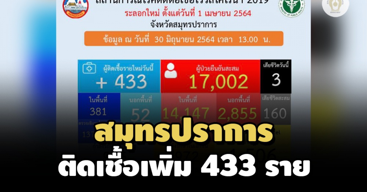 ผู้สื่อข่าวรายงานว่า เมื่อวันที่ 30 มิ.ย.2564 สำนักงานสาธารณสุขจังหวัดสมุทรปราการ รายงานสถานการณ์การระบาดประจำวัน ข้อมูลเมื่อเวลา 13.00 น. พบผู้ป่วยรายใหม่ จำนวน 433 ราย ปัจจุบันมีผู้ติดเชื้อสะสม 17,002 ราย