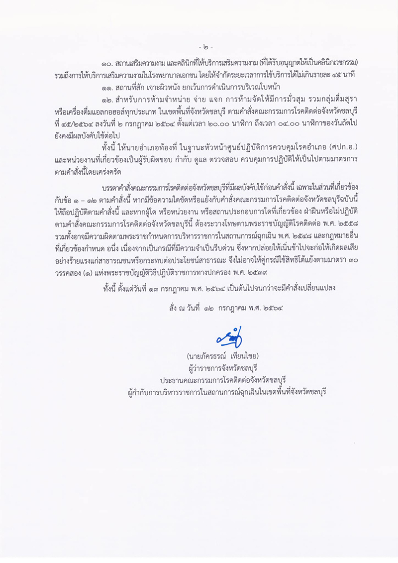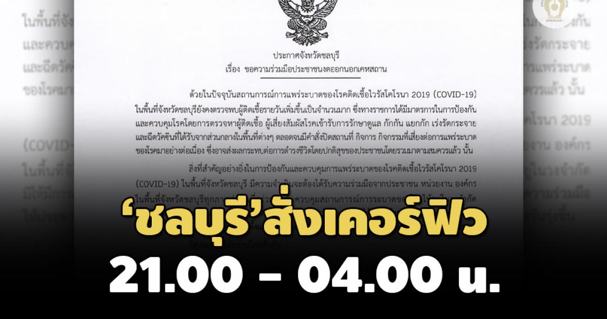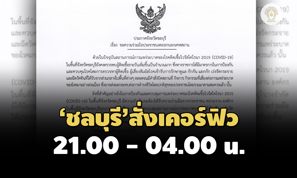 ผู้ว่าราชการจังหวัดชลบุรี ลงนามคำสั่ง ขอความร่วมมือประชาชน ห้ามออกนอกเคหสถาน 21.00 - 04.00 น. พร้อมออกข้อกำหนดเวลาเปิดปิดสถานประกอบการ 12 ประเภทกิจกรรม