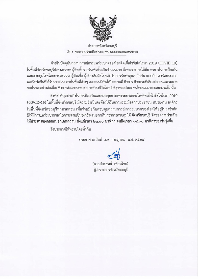 สิ่งที่สำคัญอย่างยิ่งในการป้องกันและควบคุมการแพร่ระบาดของโรค ในพื้นที่จังหวัดชลบุรี มีความจำเป็นจะต้องได้รับความร่วมมือจากประชาชน หน่วยงาน องค์กร ในพื้นที่จังหวัดทุกภาคส่วน เพ่อร่วมมือกันควบคุมสถานการณ์การระบาดของโรคให้อยู่ในวงจำกัด มิให้มีการแพร่ระบาดของโรคกระจายเป็นวงกว้างจนยากเนกว่าการควบคุมได้ จ.ชลบุรี จึงขอความร่วมมือให้ประชาชนงดออกนอกเคหสถาน ตั้งแต่เวลา 21.00 – 04.00 น. จึงประกาศให้ทราบโดยทั่วกัน