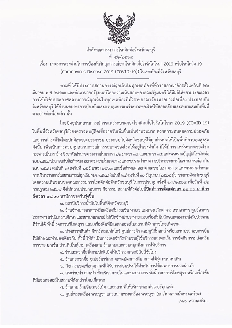 ผู้สื่อข่าวรายงานเพิ่มเติมว่า ผู้ว่าราชการจังหวัดชลบุรี ยังได้ลงนามในคำสั่งคณะกรรมการโรคติดต่อจังหวัดชลบุรี ที่ 52/2564 เรื่องมาตรกาเร่งด่วนในการป้องกันวิกฤติการณ์จากโควิดในจังหวัดชลบุรี ซึ่งส่งผลให้มีกำหนดเวลาปิดทำการของสถานประกอบการและกิจกรรมดังต่อไปนี้ ตั้งแต่เวลา 21.00 – 04.00 น. ดังนี้