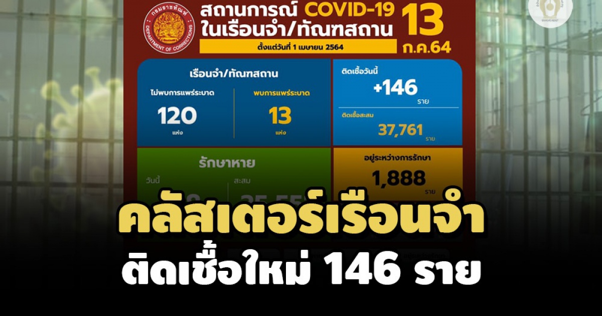 คลัสเตอร์เรือนจำติดเชื้อใหม่ 146 ราย อยู่ระหว่างการรักษา 1,888 ราย หายป่วยอีก 88 ราย รักษาหายแล้วกว่า 94.2% กรมราชทัณฑ์เร่งดำเนินการฉีดวัคซีนสร้างภูมิแก่ผู้ต้องขัง