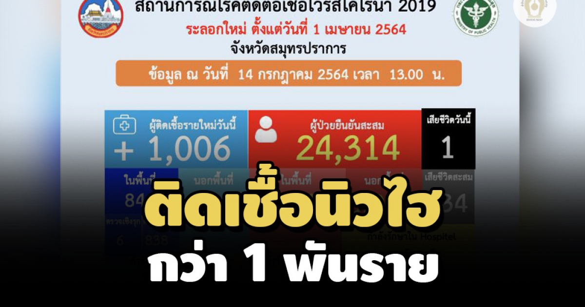 จังหวัดสมุทรปราการ มีผู้ติดเชื้อรายใหม่ทะลุ 1 พัน รวมผู้ป่วยสะสมจากการระบาดระลอกใหม่ 24,314 ราย อยู่ระหว่างการรักษาตัวใน รพ. 4,410 ราย เหลือเตียงว่าง 1,113 เตียง