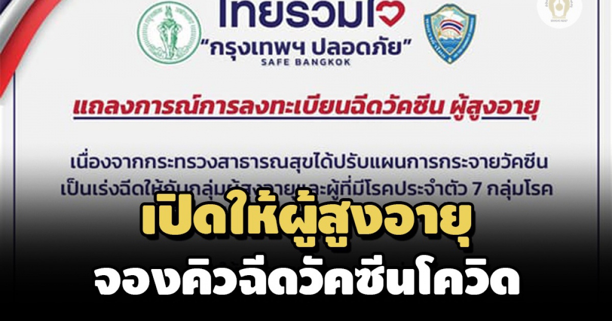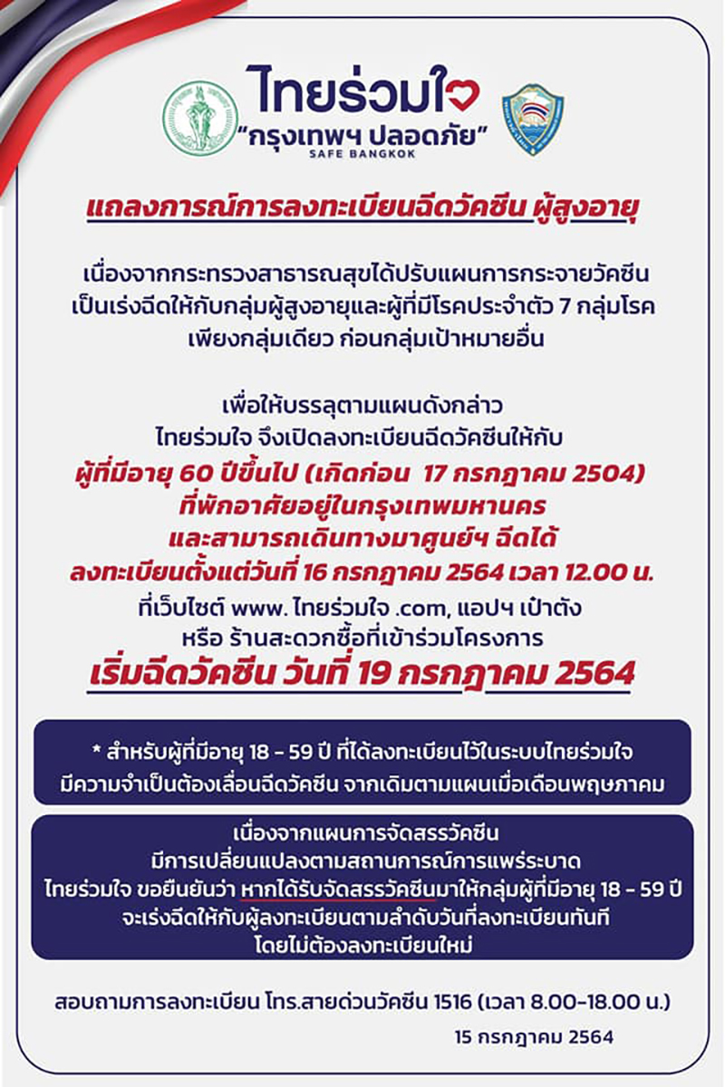 ผู้สื่อข่าวรายงานว่า เมื่อวันที่16 ก.ค.2564 เฟซบุ๊กเพจ ไทยร่วมใจ กรุงเทพฯปลอดภัย ของกรุงเทพมหานคร ออกแถลงการณ์เรื่องการลงทะเบียนฉีดวัคซีนผู้สูงอายุ