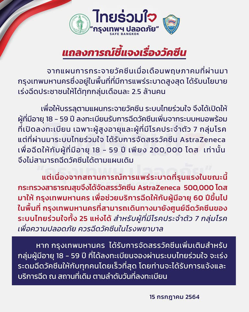 แต่เนื่องจากสถานการณ์การแพร่ระบาดที่รุนแรงในขณะนี้ กระทรวงสาธารณสุข จึงได้จัดสรรวัคซีนแอสตร้าเซนเนก้า 500,000 โดส มาให้ กรุงเทพมหานคร เพื่อช่วยบริการฉีดให้กับผู้มีอายุ 60 ปีขึ้นไป ในพื้นที่กรุงเทพมหานคร ที่สามารถเดินทางมายังศูนย์ฉีดวัคซีนของ ระบบไทยร่วมใจทั้ง 25 แห่งได้ สําหรับผู้ที่มีโรคประจําตัว 7 กลุ่มโรค เพื่อความปลอดภัย ควรฉีดวัคซีนในโรงพยาบาล