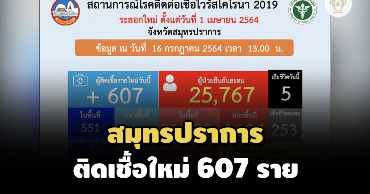 ผู้สื่อข่าวรายงานว่า เมื่อวันที่ 16 ก.ค.2564 สำนักงานสาธารณสุขจังหวัดสมุทรปราการรายงานสถานการณ์ประจำวัน เปิดเผยว่า จังหวัดสมุทรปราการมีผู้ติดเชื้อรายใหม่ จำนวน 607 ราย ปัจจุบันมีผู้ติดเชื้อสะสมจากการระบาดระลอกใหม่ 25,767 ราย