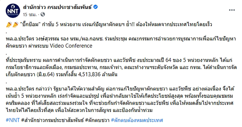 ผู้สื่อข่าวรายงานว่า เมื่อวันที่ 21 ก.ค.2564 กรมประชาสัมพันธ์ เผยแพร่ผ่านเฟซบุ๊ก สำนักข่าว กรมประชาสัมพันธ์ ระบุว่า พล.อ.ประวิตร วงษ์สุวรรณ รองนายกรัฐมนตรี ในฐานะผู้อำนวยการกองอำนวยการน้ำแห่งชาติ (กอนช.) ร่วมประชุม คณะกรรมการอำนวยการบูรณาการเพื่อแก้ไขปัญหาผักตบชวา ผ่านระบบวีดีโอคอนเฟอเรนซ์ โดยที่ประชุมรับทราบ ผลการดำเนินการกำจัดผักตบชวา และวัชพืช งบประมาณปี 2564 ของ 5 หน่วยงานหลัก ได้แก่ กรมโยธาธิการและผังเมือง, กรมชลประทาน, กรมเจ้าท่า, คณะทำงานฯระดับจังหวัด และ กทม. ได้ดำเนินการจัดเก็บผักตบชวา จนถึงเดือน มิ.ย.2564 รวมทั้งสิ้น 4,513,836 ล้านตัน