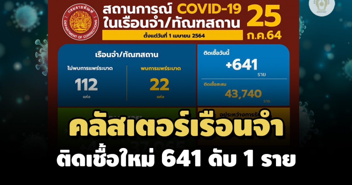 คลัสเตอร์เรือนจำป่วยใหม่ 641 ราย เสียชีวิต 1 ราย หายป่วยเพิ่ม 4 ราย อยู่ระหว่างการรักษาอยู่ 6,260 ราย กรมราชทัณฑ์เผยเร่งคัดแยกผู้ต้องขังติดเชื้อให้ได้รับการรักษาต่อเนื่อง