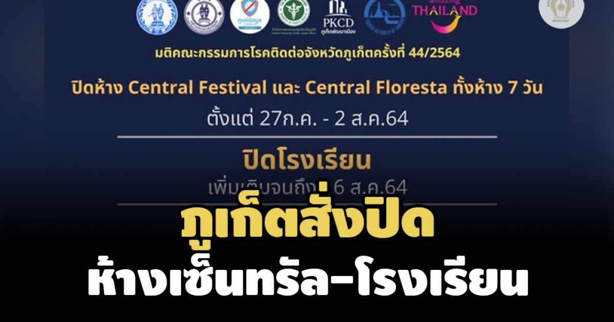 จังหวัดภูเก็ตออกคำสั่งปิดห้างเซ็นทรัลทุกส่วน 7 วัน เริ่ม 27 ก.ค.-2 ส.ค.64 พร้อมสั่งปิดโรงเรียน ถึง 16 ส.ค.2564 ปรับให้เรียนผ่านระบบออนไลน์ หลังพบผู้ติดเชื้อเพิ่มสูงในหลายพื้นที่และเชื้อมีการแพร่ระบาดอย่างรวดเร็ว