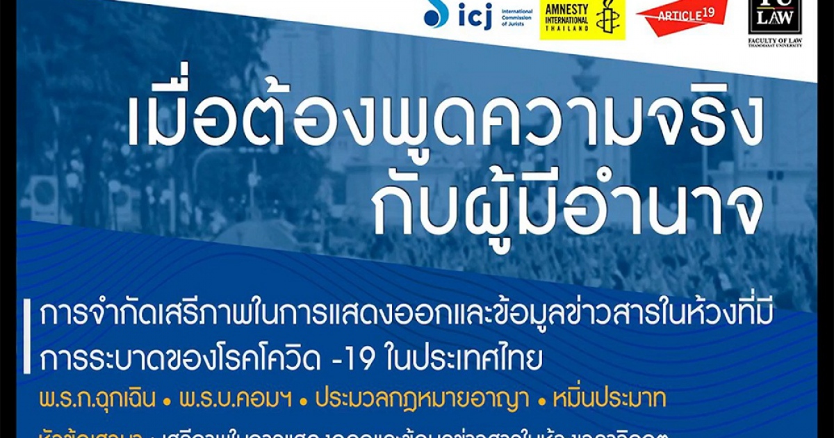 แอมเนสตี้ อินเตอร์เนชั่นแนล ประเทศไทยร่วมกับ คณะกรรมการนักนิติศาสตร์สากล (ICJ) องค์กร ARTICLE 19 และคณะนิติศาสตร์ มหาวิทยาลัยธรรมศาสตร์ จัดงานเสวนา “เมื่อต้องพูดความจริงกับผู้มีอำนาจ” การจำกัดเสรีภาพในการแสดงออกและข้อมูลข่าวสาร ในห้วงที่มีการระบาดของโควิด - 19 ในประเทศไทย เนื่องจาก ที่ผ่านมาประเทศไทยเผชิญหน้ากับปัญหาการปิดกั้นการแสดงความคิดเห็นอย่างหนักโดยเฉพาะช่วงที่มีการระบาดของโรคโควิด-19 โดยมีประชาชนหลายคนวิพากษ์วิจารณ์การทำงานของรัฐบาลแต่กลับถูกดำเนินคดี งานเสวนาครั้งนี้จึงจัดขึ้นเพื่อย้ำให้เห็นถึงปัญหาการแสดงออกและสิทธิมนุษยชนในประเทศไทย