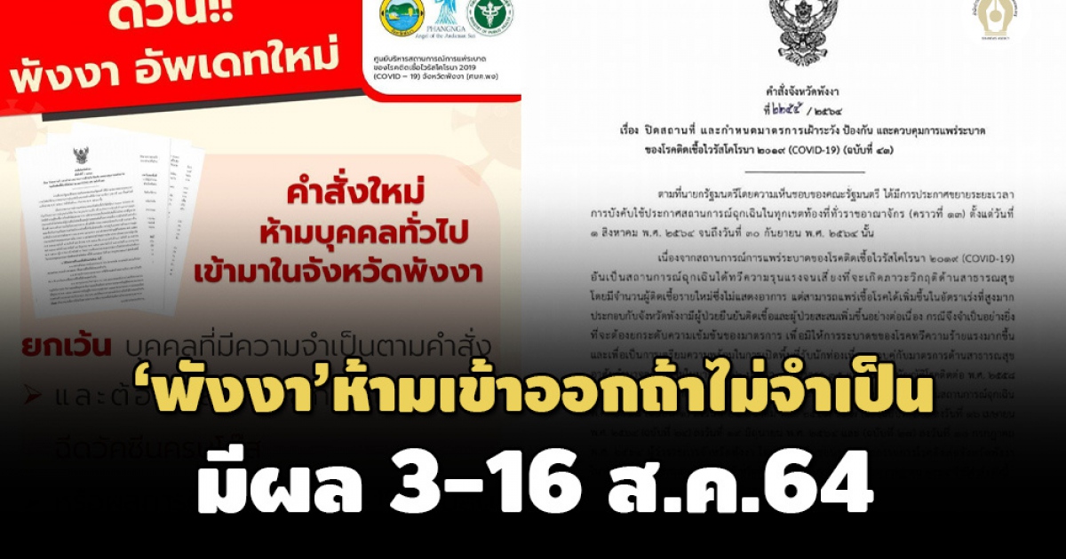 จังหวัดพังงา ออกคำสั่ง ห้ามคนเข้าออกถ้าไม่จำเป็น เว้นแต่ฉีดวัคซีนครบโดส หรือผลตรวจเป็นลบก่อนเดินทาง 3 วัน โดยให้มีผลตั้งแต่ 3-16 ส.ค.64