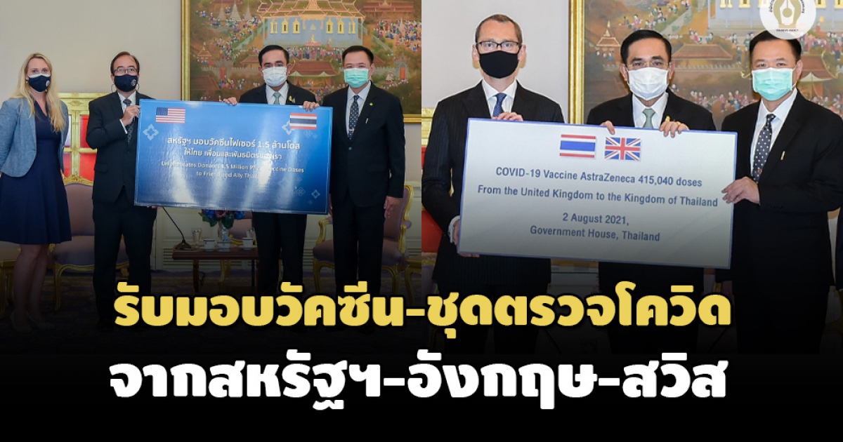 นายกฯ ร่วมพิธีรับมอบ ‘ไฟเซอร์' 1.5 ล้านโดส จากรัฐบาลสหรัฐฯ พร้อมรับมอบ 'แอสตร้าเซนเนก้า' 415,040 โดส จากรัฐบาลสหราชอาณาจักร นอกจากนี้ยังรับมอบชุดตรวจโควิด ATK 1.1 ล้านชุด พร้อมเครื่องช่วยหายใจ 102 เครื่องจากสมาพันธรัฐสวิส