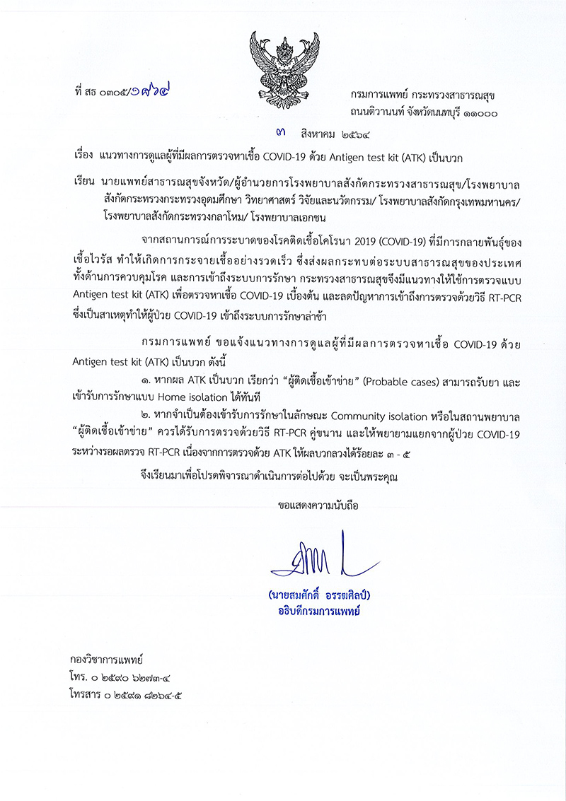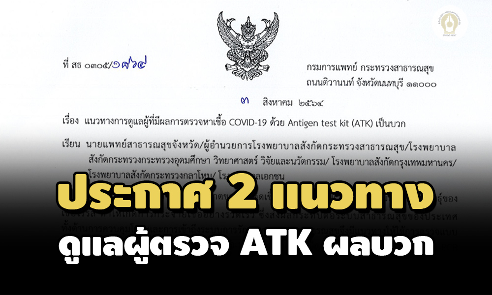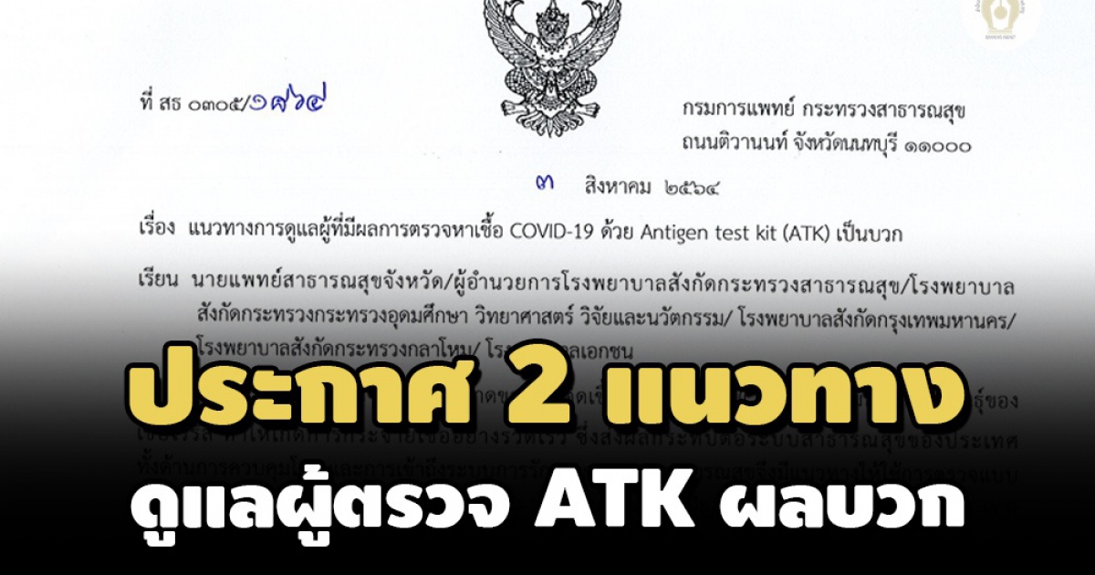 ผู้สื่อข่าวรายงานว่า เมื่อวันที่ 3 ส.ค.2564 นพ.สมศักดิ์ อรรฆศิลป์ อธิบดีกรมการแพทย์ ลงนามประกาศกระทรวงสาธารณสุข เรื่องแนวทางการดูแลผู้ที่มีผลตรวจหาเชื้อโควิดด้วย Antigen Test Kit (ATK) เป็นบวก ส่งถึงนายแพทย์สาธารณสุขจังหวัด ผู้อำนวยการโรงพยาบาลสังกัดกระทรวงสาธารณสุข โรงพยาบาลสังกัดกระทรวงอุดมศึกษา วิทยาศาสตร์ วิจัยและนวัตกรรม โรงพยาบาลสังกัดกรุงเทพมหานคร โรงพยาบาลสังกัดกระทรวงกลาโหม และโรงพยาบาลเอกชน มีสาระสำคัญระบุว่า จากสถานการณ์การระบาดของโควิดที่มีการกลายพันธุ์ของเชื้อไวรัส ทำให้เกิดการกระจายเชื้ออย่างรวดเร็ว ส่งผลกระทบต่อระบบสาธารณสุขของประเทศ ทั้งด้านการควบคุมโรค และการเข้าถึงระบบรักษา กระทรวงสาธารณสุขจึงมีแนวทางให้ใช้การตรวจแบบ ATK เพื่อตรวจหาเชื้อโควิด ลดปัญหาการเข้าถึงการตรวจ RT-PCR ซึ่งเป็นสาเหตุทำให้ผู้ป่วยโควิดเข้าถึงระบบล่าช้า